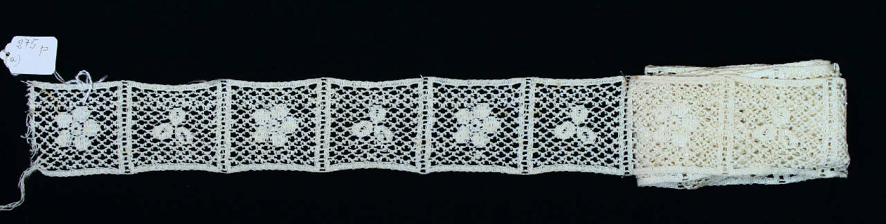 Tramezzo in cotone avorio definito dalla successione di incorniciature quadrate che racchiudono un fiore 5 petali: fondo a rete romboidali con piccoli picot e decoro ad imitazione del punto tela.