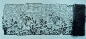 Merletto in seta nera, con fondo a rete quadrata e decoro definito da un sottile tralcio sinuoso che sostiene grandi fiori; il tralcio si adagia su uno dei due bordi; il secondo bordo è percorso dal piede. Il decoro è definito da diverse tipologie di reti ed è sottolineato da un filato più spesso.