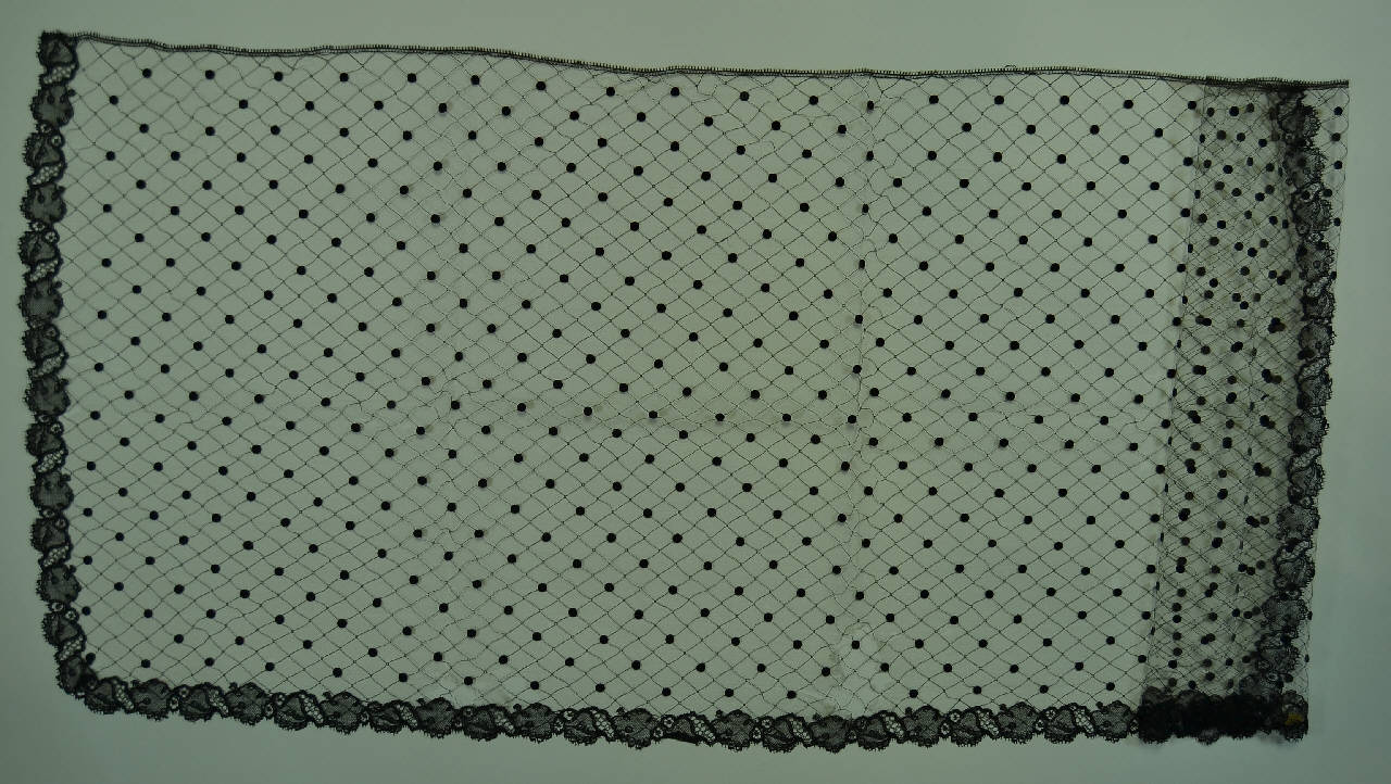 Fondo a maglie romboidali decorato da piccoli pois in velluto nero disposto a scacchiera; tre lati sono rifiniti con un sottile merletto nero con orlo smerlato percorso da fiori stilizzati e decorato da sinuose foglie campite da una rete tipo mignon e da motivi geometrici campiti da una fitta rete a maglie esagonali; i contorni del disegno sono sottolineati da un filato più spesso. Il velo è doppiato in tulle bianco.