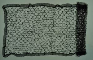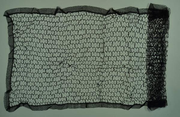 Velo rettangolare in seta nera, definito da una rete a maglie quadrangolari in filato più spesso, decorato da due coppie di cappietti che trattengono una rete a maglie romboidali creata da un filato molto sottile. E' bordato ai quattro lati da tulle nero decorato da un motivo a rombi.