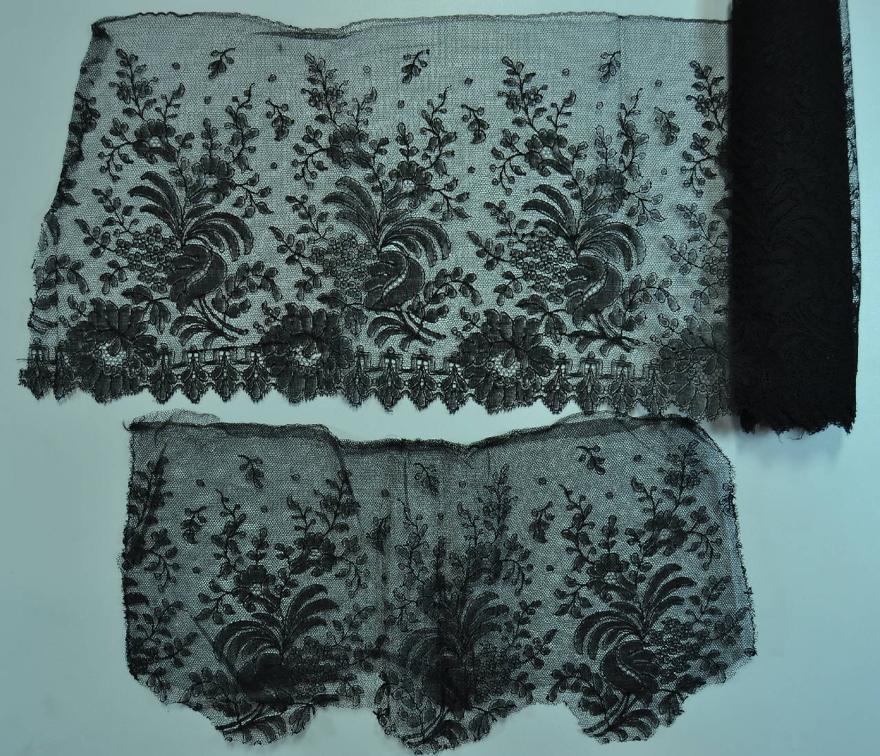 Bordo in seta nera, fondo a maglie esagonali e decoro definito da grandi rami fioriti. Lungo l'orlo smerlato, percorso da palmette stilizzate, si stagliano rose naturalistiche. Il decoro, sollevato da filati di maggiore spessore, è definito da diverse tipologie di reti.