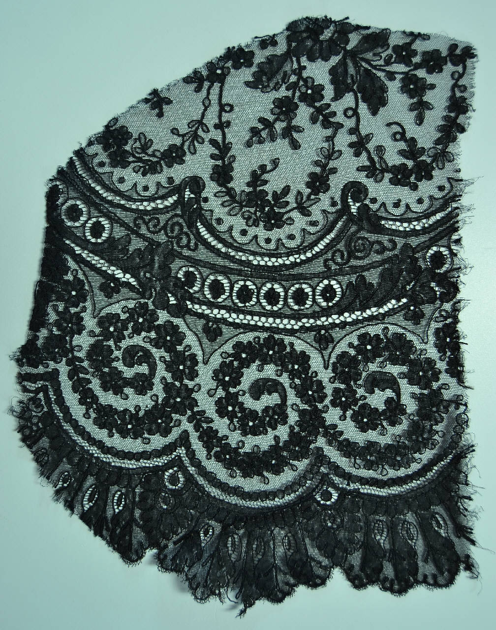 Frammento in seta nera, fondo a maglie esagonali decorato da tralci fioriti e fronzuti, seguito da una cornice definita da motivi a mezzaluna smerlati e decori a perla intervallati a foglie arricciate; a questa fascia ne segue un'altra impreziosita da ghirlande disposte a spirali inserite entro incorniciature parziali a cerchio, a cui si unisce un decoro a finta balza arricciata, con orlo festonato, ornato da foglie di quercia. Il decoro, sollevato da filati più spessi è eseguito con diverse tipologie di reti.