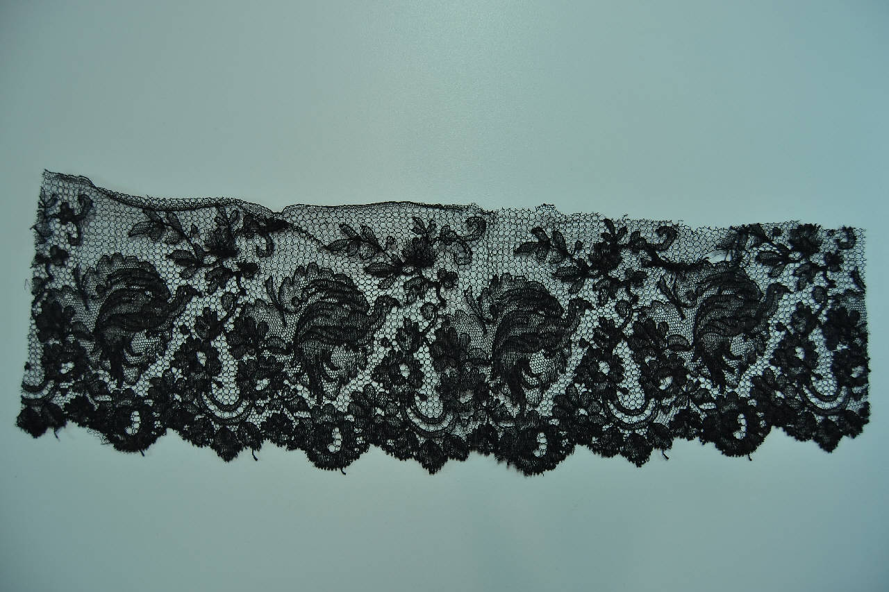 Bordo in seta nera, fondo a maglie esagonali e decoro definito da foglie stilizzate arricciate interposte a rametti fioriti e a piccole rose; lungo l'orlo festonato sono posti rose e rametti fronzuti. Il decoro, sollevato da filati più spessi, è realizzato con diverse tipologie di reti.