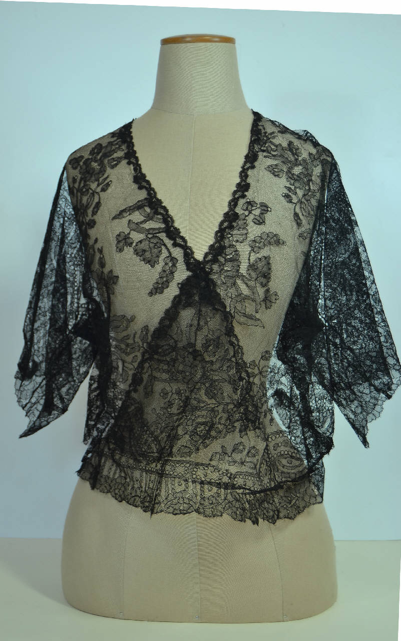 Giacca in seta nera, lavorata a fuselli, anteriormente scollo a V, apertura completa che termina con lembi triangolari; dorso con scollo a V, maniche a kimono corte al gomito. Fondo a maglie esagonali e decoro definito da rami fioriti e fronzuti che si intrecciano con nastri sinuosi ornati da un motivo a perle; il decoro è definito da diverse tipologie di rete. Rifinito con un bordino meccanico lavorato con macchina Leavers in seta nera ornato da motivi mistilinei.