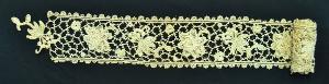 Bordo in cotone avorio, decorato da fiori stilizzati con contorni a rilievo e uniti da una fitta rete irregolare di barrette; il disegno corre fra due bordi paralleli a giorno, ornati esternamente da ruote smerlate.