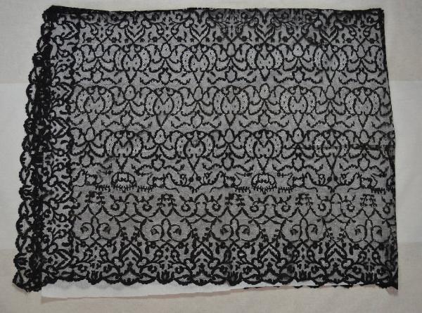 La mantiglia è realizzata piegando a metà un pannello rettangolare di pizzo in seta nera e cucendolo lungo il lato lungo. Il pizzo presenta una fitta decorazione floreale stiizzata disposta a scacchiera a tutto campo. Il fondo è in una leggera rete esagonale ed il decoro è definito da una lavorazione ad imitazione del punto tela. Orlo smerlato.
