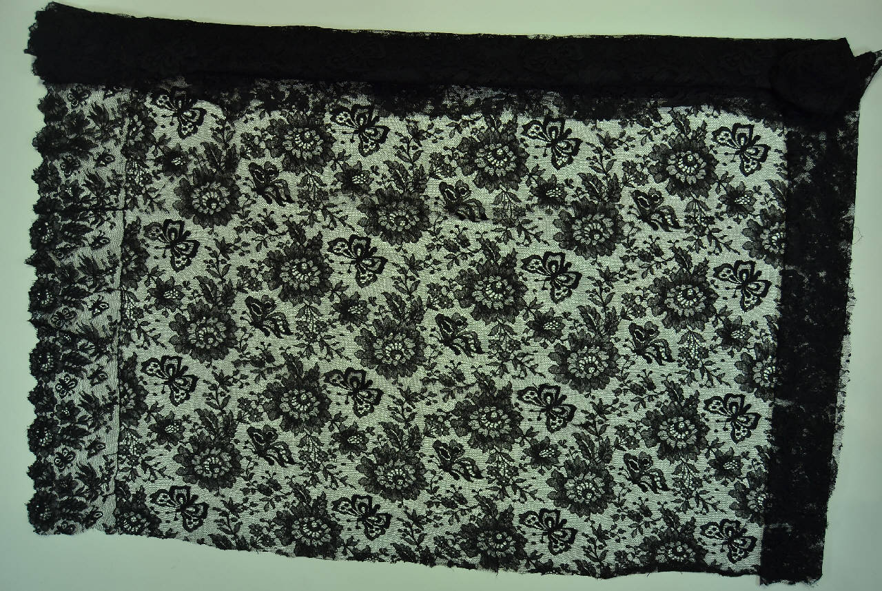 Pannello nero ad imitazione di merletto a fuselli: sul fondo a rete esagonali si staglia un fitto decoro definito da fiori naturalistici disposti a scacchiera; fra i fiori volano farfalle rappresentate in due modi (ad ali aperte e di profilo). Su un lato orizzontale è cucito un alto bordo, in cui grandi rose sono disposte lungo il bordo e reggono rami fioriti e fronzuti, fra i quali volano farfalle. Il decoro, rilevato da filati più spessi, è eseguito con diverse tipologie di reti.