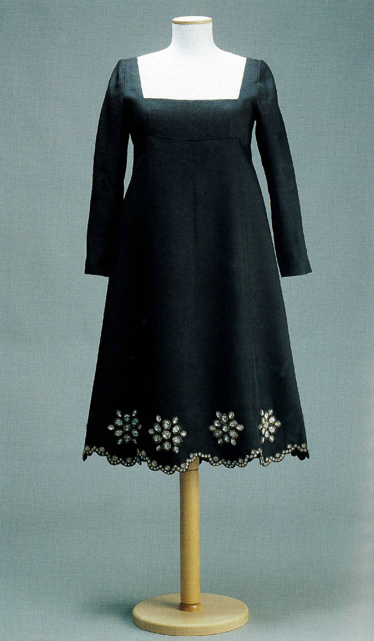 Abito intero da sera tagliato a vita alta. Il corpetto, con ampia scollatura rettangole, è allacciato al centro dietro con tre bottoni ricoperti. Le maniche lunghe a guanto, montate a giro, sono strette al polso da una cerniera nascosta. La gonna a quattro teli svasati ha l'orlo a festoni smerlati, ricamati a mano con grandi fiori stilizzati dai petali costituiti da strass rotondi, a goccia e a navette, circondati da intrecci di perline argentate e festoni di catenelle metelliche.
