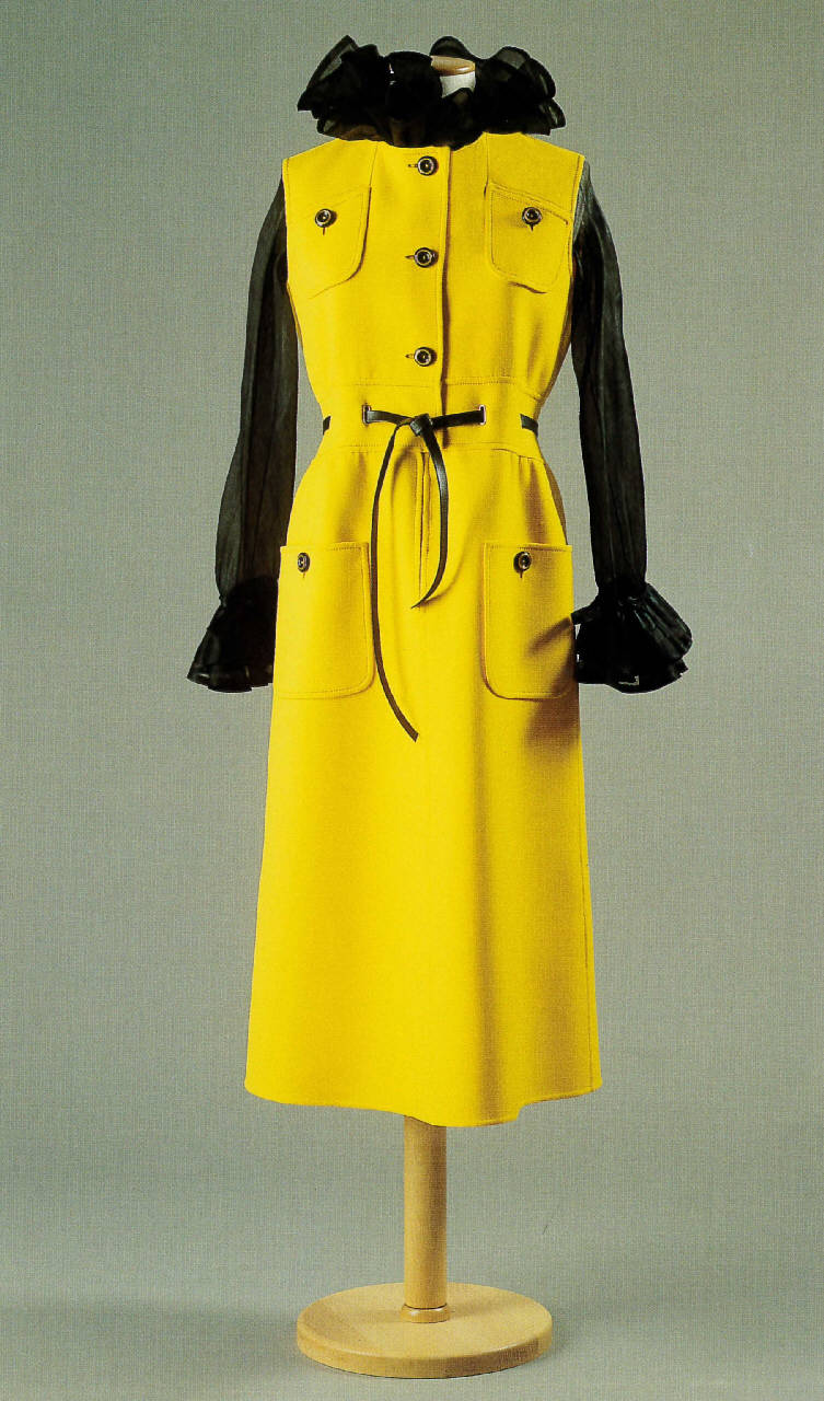 - NOTIZIE STORICO CRITICHE Abito confezionato con tessuti Nattier per la collezione alta moda primavera-estate 1970.\nIn "Harper's Bazaar Italia", Silvana Bernasconi scrive "quando il giallo non è solo giallo, ma accompagnato drammaticamente dal nero: la robe-manteau senza maniche, leggermente svasata verso il basso per un effetto verticale, tasche altissime e cintura sopra la vita [...] Gli accessori sono tutti neri. Cappello Valentino / calze Fama / scarpe Dal Cò per Valentino".