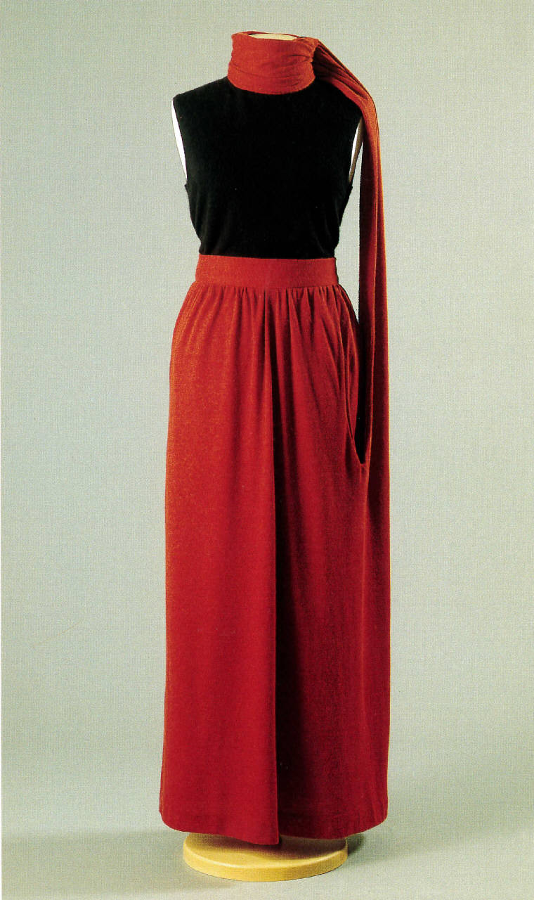 - NOTIZIE STORICO CRITICHE Il modello, appartenente alla collezione prêt-à-porter 1974, comprendeva una cintura con fibbia e una maglietta di jersey nero, non pervenuti.