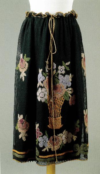 La gonna è confezionata in un unico telo cucito dietro, arricciato da un cordoncino passato attraverso le maglie del filet. Il filet è ricamato a macchina con un motivo di cesto di fiori, rose e bordi geometrici. La sottogonna è profilata con passamaneria.