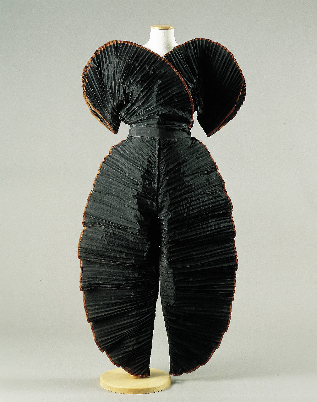 La tuta è confezionata in due strati. La tuta interna, tagliata in vita, presenta un corpino scollato a punta, con mezze maniche a chimono e cerniera al centro davanti. In vita è inserita una cintura che si allaccia sul fianco. I pantaloni, diritti, hanno l'orlo obliquo e arrotondato. Su questa base sono applicati teli, tagliati secondo figure geometriche arrotondate, fittamente plissettati e bordati con un nastro color ruggine. Nei pantaloni, i teli sono cuciti fra loro nella parte interna delle gambe e nel busto sono sovrapposti e cuciti sotto le ascelle e alla cintura, mentre gli orli esterni sono lasciati liberi in modo da aprirsi a ventaglio. La plissettatura va verso l'esterno nei pantaloni e verso l'alto nel busto.