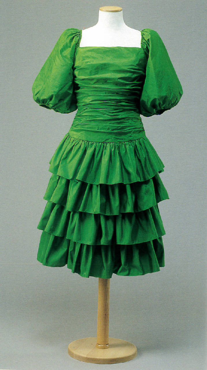 Abito da sera corto intero tagliato a vita bassa. Il corpetto aderente è in due teli in sbieco arricciati lungo fianchi, che creano drappeggio. La scollatura quadrata, più profonda sul dorso, è delimitata dalle maniche a palloncino, montate arricciate sulle spalle e chiuse con elastici nascosti. Nelle maniche il tessuto è usato per trama. La gonna è costituita da quattro balze arricciate, applicate a una fodera verde oliva.