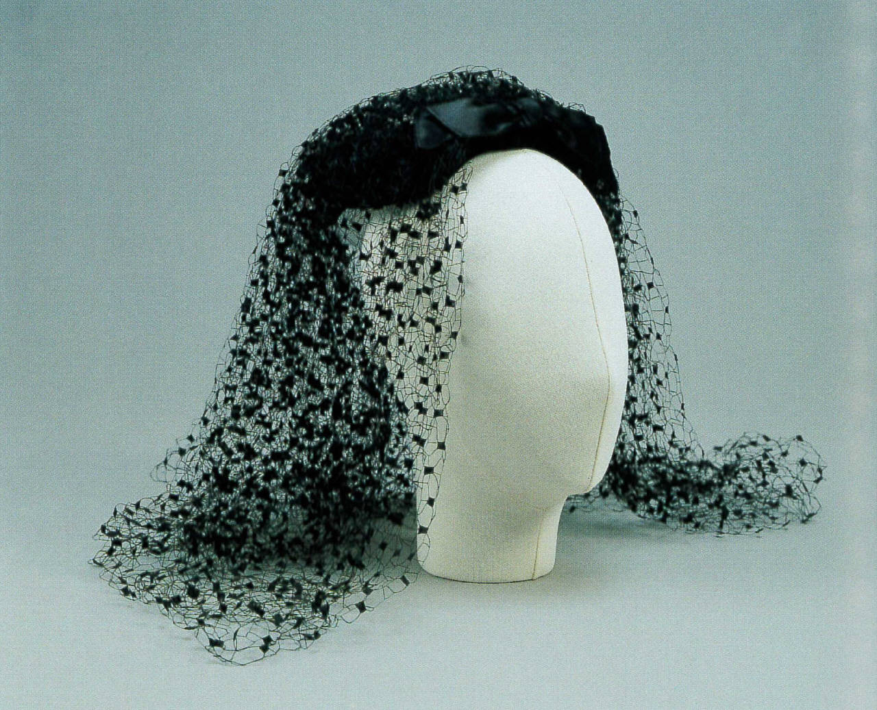 Acconciatura formata da una doppia C sagomata di velluto, applicata su cerchietto e munita di pettinino. Nella aprte centrale è applicata una cascata di point d'esprit arricciato. Sul punto di attaccatura è cucito un fiocco piatto di raso.