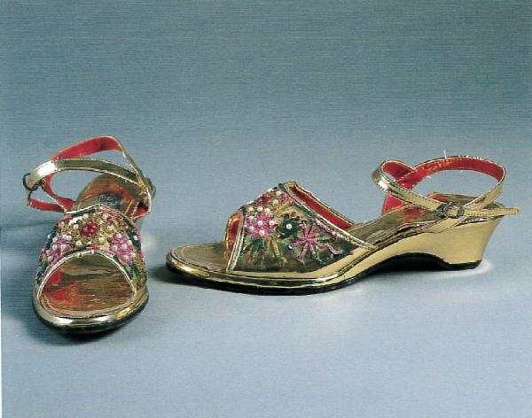 Sandali con tomaia di vernice oro, ricamata con motivi floreali ad applicazione di perle, coralli colorati, perline e paillettes. Laccio alla caviglia e cinturino al collo del piede, chiuso da una fibbia a incastro. Punta arrotondata. Tacco a zeppa ricoperto. Sottopiede di vernice oro. Fodera di plastica rossa. Suola di cuoio.