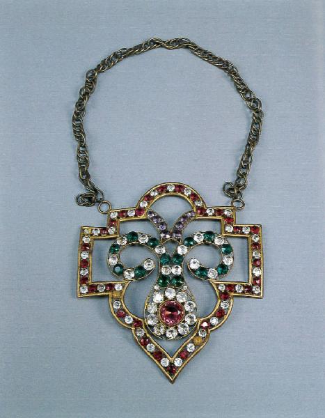 Collana con grande pendente quadrilobato di metallo, lavorato a giorno, con motivo a volute e floreale completamente decorato di perle di vetro colorate incastonate. Catena ad anelli multipli.\nAlcune perle sono mancanti.