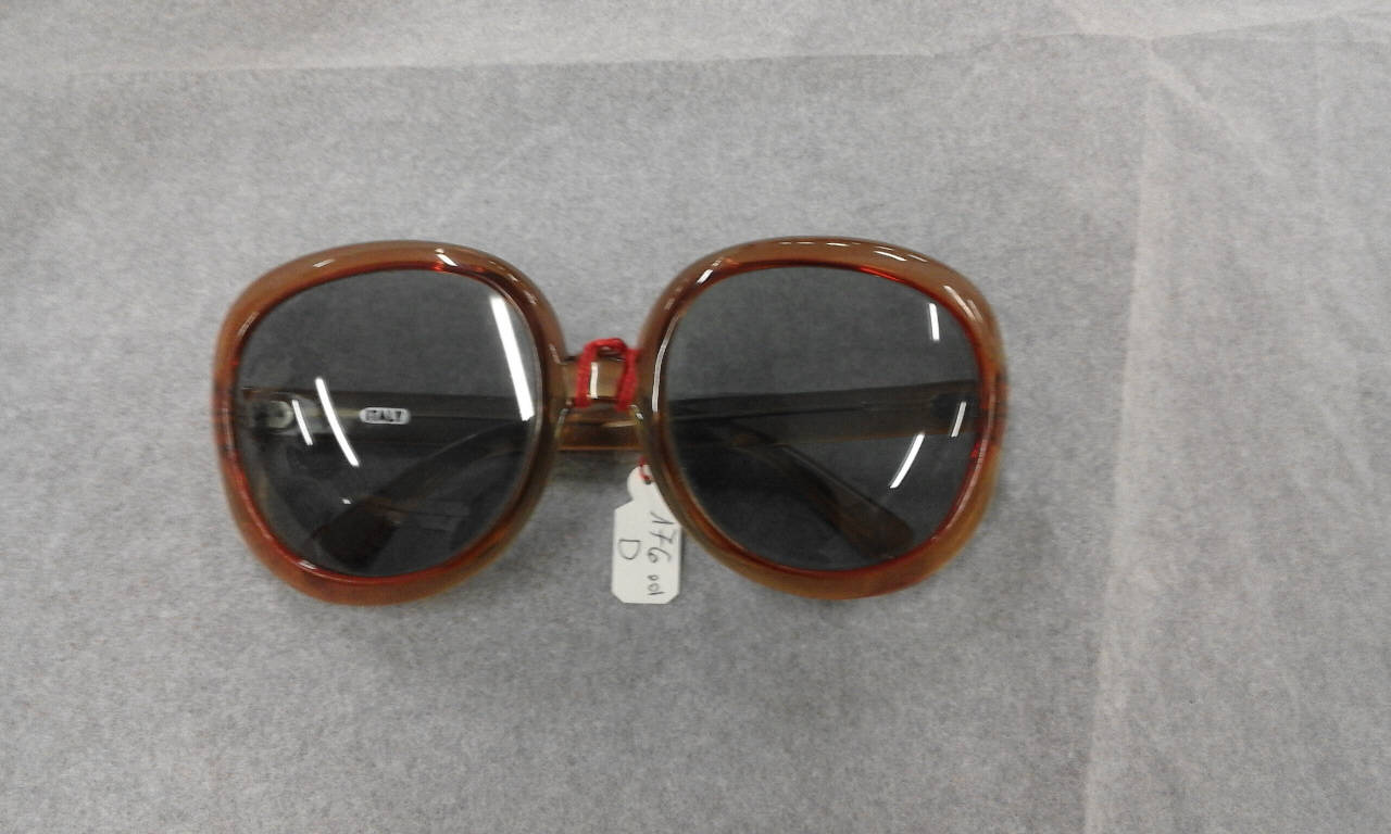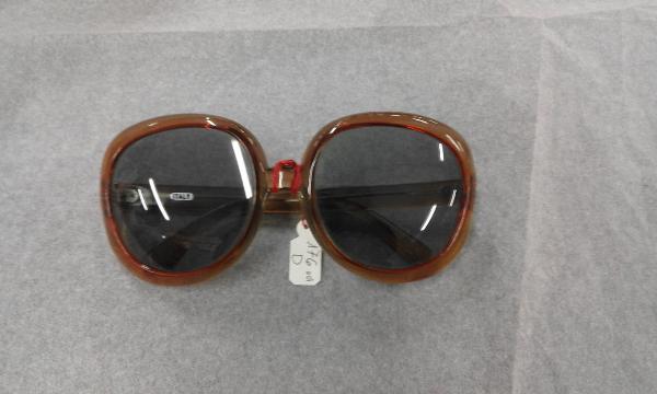 Occhiali da sole con montatura ambrata e lenti scure di forma circolare.