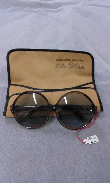 Occhiali da sole con montatura bruna e lenti circolari.\nConservate in custodia apposita di "realizzazione esclusiva" dallo "Studio Sinthèsis".