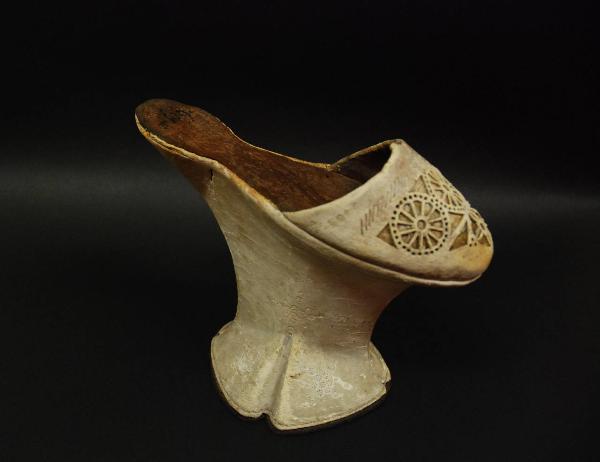 Pianella con tomaia in pelle di capretto sbiancata, decorata a traforo con motivi a rosone. Zeppa di 16 cm in legno cavo, sagomata e centinata, ricoperta come la tomaia.