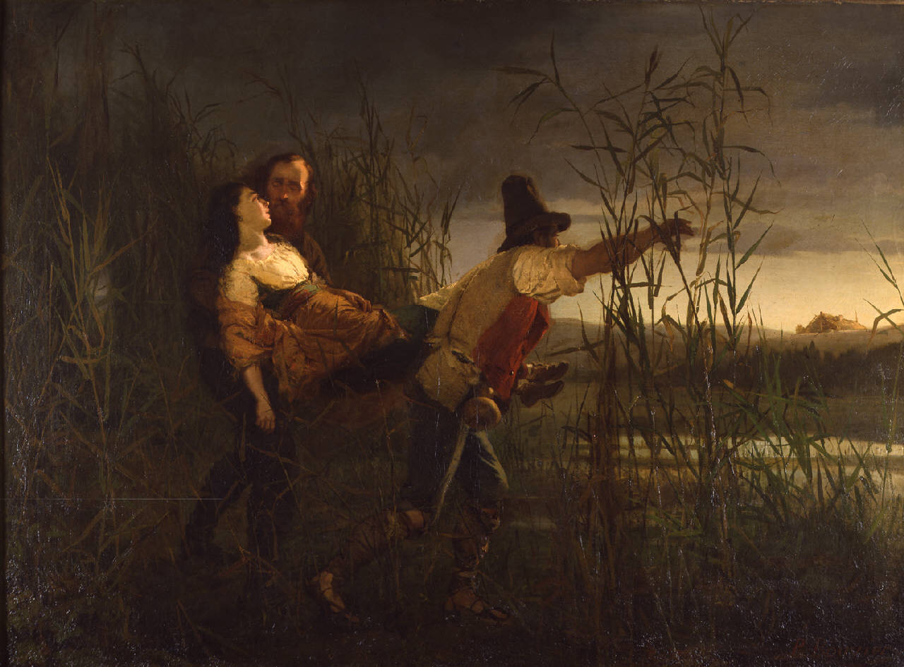 - NOTIZIE STORICO CRITICHE Episodio storico-marrativo con figure in scale medio grande in paesaggio naturale (paludi di Comacchio). Dopo la caduta della Repubblica romana, Garibaldi fu costretto alla fuga e così ad assistere alla morte della moglie Anita, in attesa di un figlio, stremata dalle fatiche della marcia. Nel dipinto insieme al Maggiore Leggero (Giovanni Battista Culiolo).