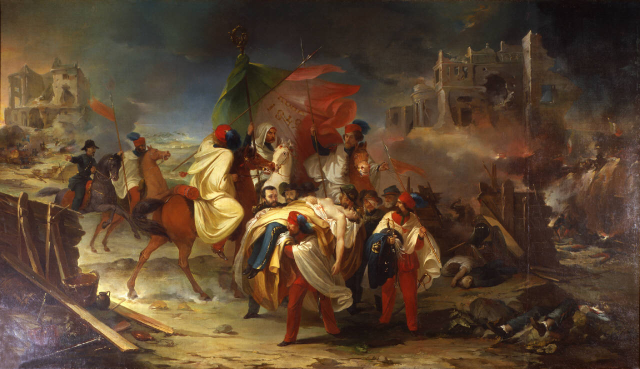 I bersaglieri lombardi e i lancieri della morte trasportano Luciano Manara gravemente ferito a Villa Spada. I bersaglieri lombardi e i lancieri della morte trasportano Luciano Manara gravemente ferito a Villa Spada