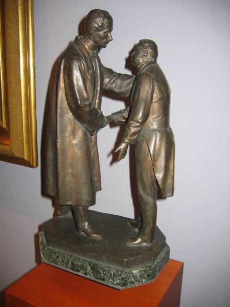 - NOTIZIE STORICO CRITICHE L'opera immortala un episodio storico realmente accaduto. Si tratta della visita che Luigi Cibrario fece all' ex Re Carlo Alberto nel maggio 1849 a Oporto in Portogallo. Il Cibrario, che all'epoca era sanatore del Regno fu incaricato ufficialmente dal Parlamento di fare visita a Carlo Alberto, che da poco tempo aveva abdicato in favore del figlio Vittorio Emanuele e si era ritirato in Portogallo. questa fu l'ultima visita ufficiale perchè il 28 luglio l'ex re morì. Al Cibrario fu delegata l'organizzazione dei funerali. Dal registro di carico del Museo del Risorgimento emerge che l'opera fu donata da Amilcare Ancona nel 1887 e che si tratta di un bozzetto commissionato direttamente dal Conte Cibrario, perciò la datazione dell'opera non può andare oltre il 1870, anno di morte di quest'ultimo.