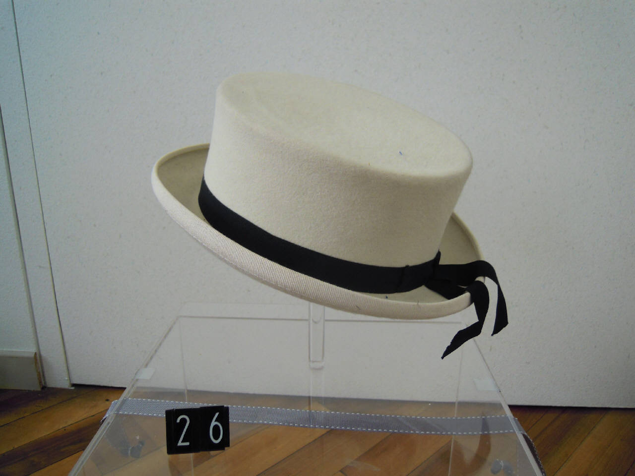 Cappello in feltro panna a cupola dritta e piatta, con tesa circolare, rigida e corta; con nastro nero.