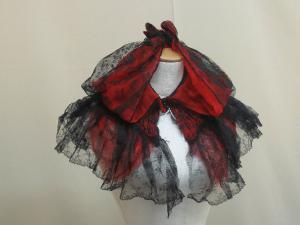 cappuccio e pannello dorsale separati, in merletto nero, doppiato in crespo molto trasparente rosso. Cappuccio ampio, con arricciatura che forma effetto di fiocco in corrispondenza della fronte; fissato alla basa ad una corta mantellina fittamente arricciata presso il collo a listino chiuso anteriormente da ganci. La mantellina in diverso merletto meccanico, è doppiata da un diverso crespo rosso. \nPannello lungo, formato da 2 teli di merletto; fitta pieghettatura riduce la larghezza in alto, nel punto che doveva essere fissato ad altra parte. Al fondo stondato si allarga come a formare strascico
