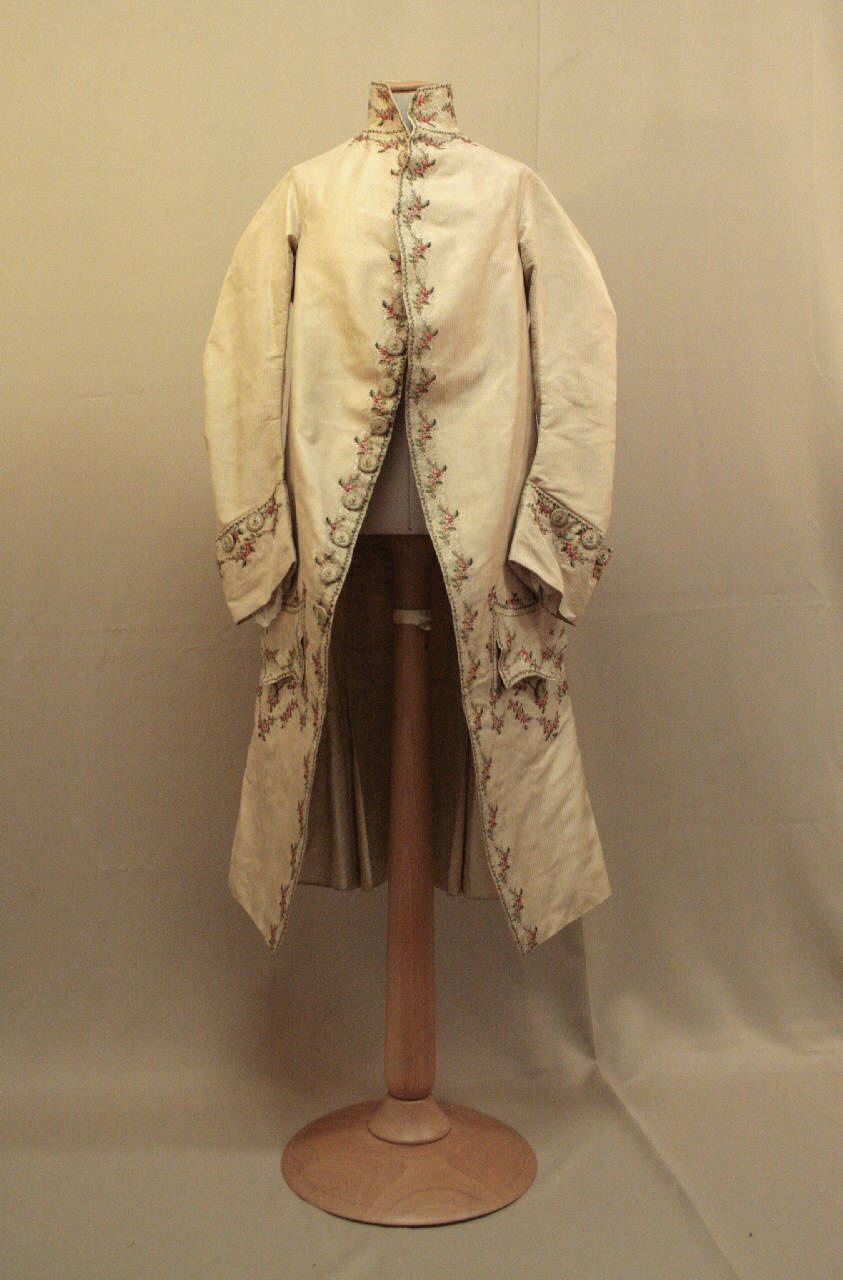 Marsina in pekin broccato ( taffetas/spina), con decoro tessuto a disposizione; fondo avorio con sottili rigature a spina, decoro dato da tralcio di roselline rosa intrecciato a otto con nastro avorio.\nCollo a cinturino (h 6 cm), mostre appena stondate con 13 bottoni rivestiti sul lato destro, senza occhielli corrispondenti; chiusa al petto da 3 ganci metallici.\nFalde appena sfuggenti verso il dietro. Tasche sotto i fianchi con patta sagomata e 3 bottoni decorativi nel sottotasca.\nManiche lunghe, sagomate, con alto paramani con 3 bottoni decorativi.\nDorso ampio che scende fino sotto il punto vita; spacchi laterali cuciti a tratti entro tripla piega decorati da bottoni in alto, centro e all'orlo; spacco centrale affiancato da due pieghe.\nFodera in diagonale avorio; nel dorso in tela bianca.\nSottoposta nel 1961 a intervento di restauro che potrebbe aver alterato la confezione originale.