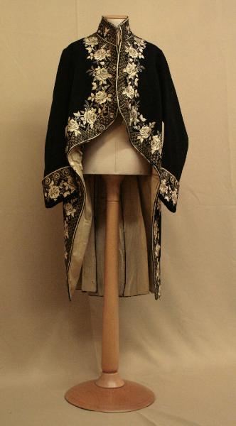 Marsina in panno nero ricamata con seta bianca a punto pieno e erba, argento filato, oro filato e paillettes; il ricamo descrive un finto merletto dorato da cui si dipartono rose bianche e argento.\nCollo a cinturino (h 6,5 cm), mostre stondate con 4 bottoni rivestiti (altri probabilmente mancanti) e 3 occhielli funzionali all'altezza del petto.\nFalde sfuggenti verso il dietro. Tasche sotto il punto vita con patta sagomata e 3 bottoni decorativi nel sottotasca.\nManiche molto lunghe, sagomate con alto paramani con 3 bottoni decorativi; le maniche sono state allargate con un inserto in panno simile.\nIl dorso è stato sostituito per allargare la marsina: è ampio e scende fino al punto vita; spacchi laterali cuciti a tratti entro piega decorati da bottoni in alto e centro; spacco centrale sovrapposto.\nFodera (di sostituzione?) in diagonale avorio (ordito in seta, trama in cotone); infustiture con diversi tipi di grossa tela naturale.\nGli interventi di allargatura sono realizzati con cuciture a macchina.