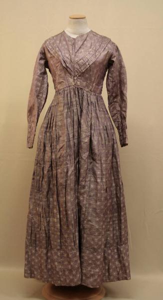 Abito lungo con corpino e gonna a crinolina, in raso liserè viola con minuto decoro floreale avorio.\nCorpino aderente, diritto in vita, girocollo, con apertura anteriore totale chiusa da ganci. Davanti in due pezzi e fianchette; dalle spalle partono tre pieghe sciolte che si riuniscono a V al punto vita.\nManiche lunghe, decorate al fondo da tre ranghi di coulisse che restringono morbidamente la manica; spacco al fondo chiuso da tre ganci.\nDietro con dorso pressoché triangolare e fianchette, linea delle spalle naturale . \nCorpino e maniche doppiati in tela naturale; nel dorso e fianchetta sinistra posteriore tra il raso e la fodera è inserita un'imbottitura in falda di lana naturale.\nGonna a sei teli, raccolta in vita da fitta pieghettatura. La gonna è cucita al corpino, eccetto un breve tratto sul davanti dove è fermata da ganci. Gonna doppiata con rada tela di cotone (tarlatana) naturale.\nSul lato anteriore destro della gonna, lungo una cucitura, è inserita una tasca a sacchetto in tela quadrettata bianca e rossa (aggiunta posteriore?).