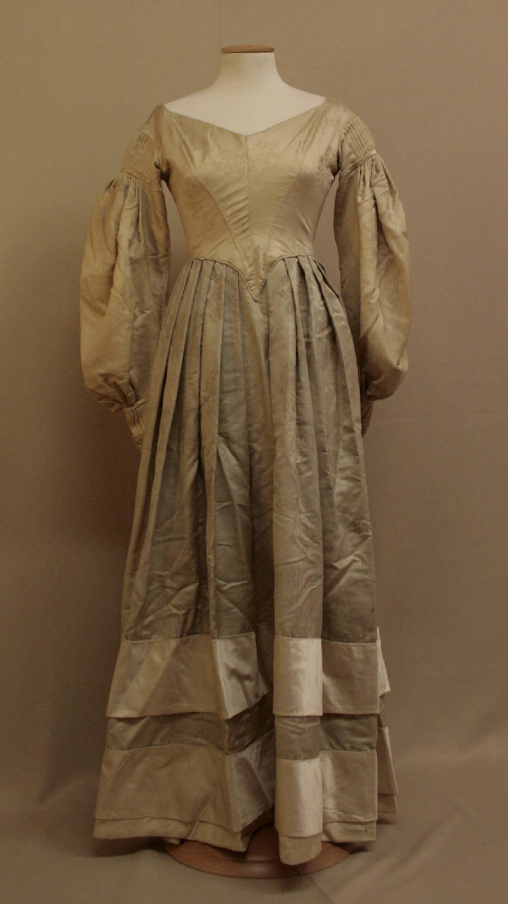 abito lungo a crinolina, in damasco di Lione (ordito in seta, trama in lana) color avorio scuro con decoro a piccoli mazzi i fiori. Corpino aderente a punta, scollo a V molto largo sulle spalle; spalle calate. Davanti in 4 pezzi profilati da nervature che definiscono un motivo a V dalle spalle alla vita. Dietro in 4 pezzi con dorso triangolare e fianchette, apertura centrale con bottoncino allo scollo, ganci e asole metallici. Maniche lunghe fantasia, ampie al gomito, ristrette all'attaccatura e al fondo da fitte pieghe verticali fermate da braccialetto in raso avorio; spacco chiuso da due bottoncini. Al fondo, all'interno, è applicato merletto avorio risvoltato sull'esterno.\nGonna a 5 teli, raccolta in vita da pieghe convergenti sul davanti e da fitta pieghettatura sul dietro. Sotto il ginocchio sono applicate due alte bande di raso avorio in sbieco.\nCorpino e maniche dopiati in taffetas avorio; mancante la fodera della gonna.