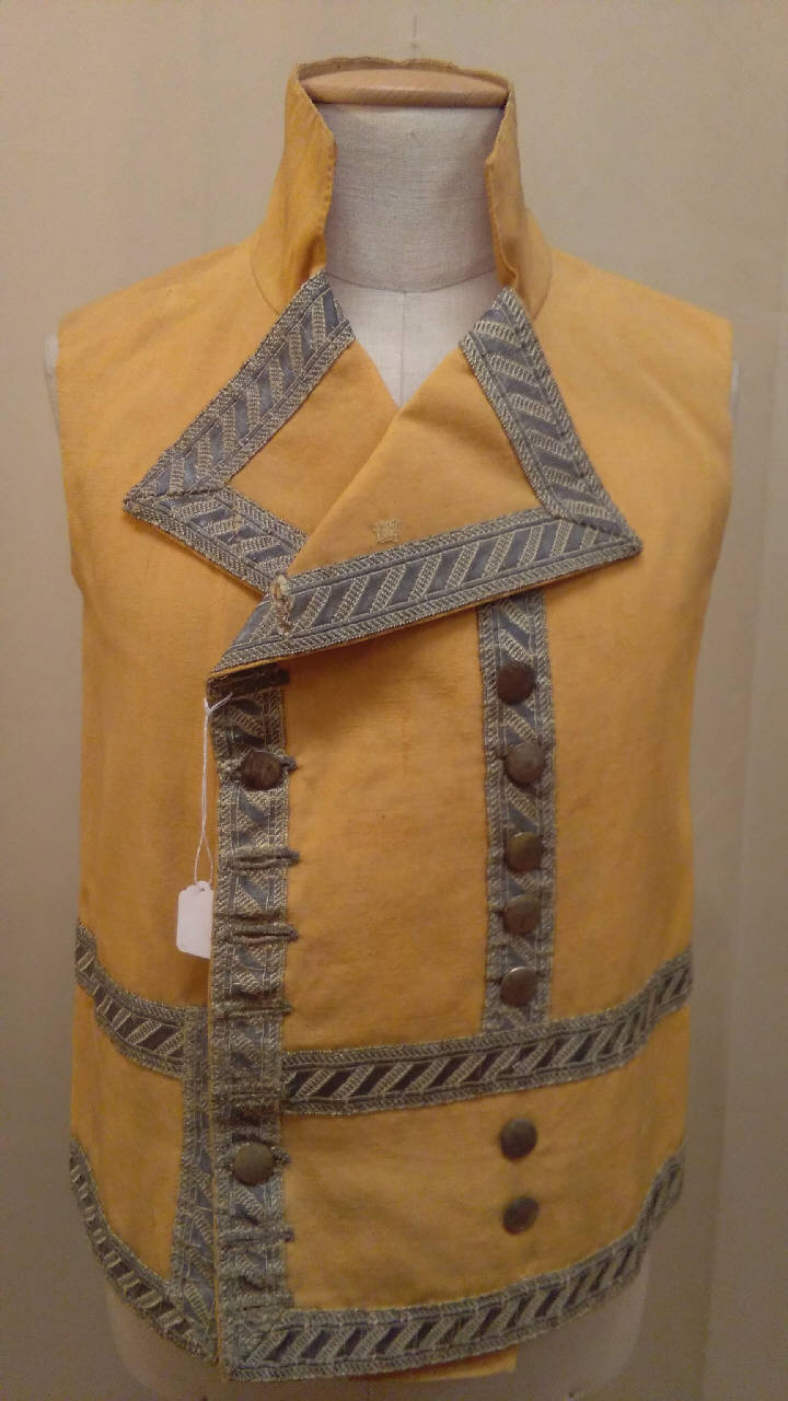 gilè doppiopetto, corto e diritto in vita. Quarti anteriori in tela di lana giallo albicocca. Chiusura con 20 bottoni di metallo argentato posti a coppie (di cui 8 mancanti). Alto collo con ampi risvolti. Un gallone artentato profila l'apertura, i risvolti e l'orlo; definisce la posizione dei bottoni e delimita una banda lungo l'orlo. Dorso in tela bianca regolabile con due coppie di fettucce.\nNel collo, all'interno, scritto ad inchiostro "Lunardo".