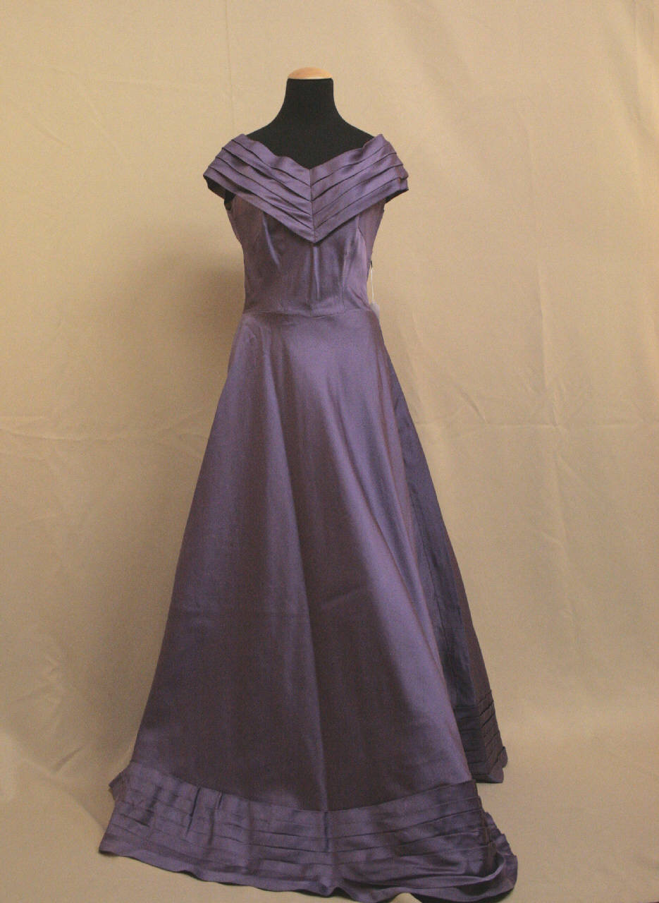 Abito lungo in cannellato viola. Corpino aderente, sagomato da pences, con ampio scollo a V profilato da banda a pieghe orizzontali che gira attorno alle spalle. Gonna a mezza ruota, ornata all'orlo da analoga banda a pieghe sovrammessa. \nApertura sul fianco sinistro con nastro stringivita e cerniera.\nAll'interno etichetta in nastro stampato riportante "Likis - Milano"