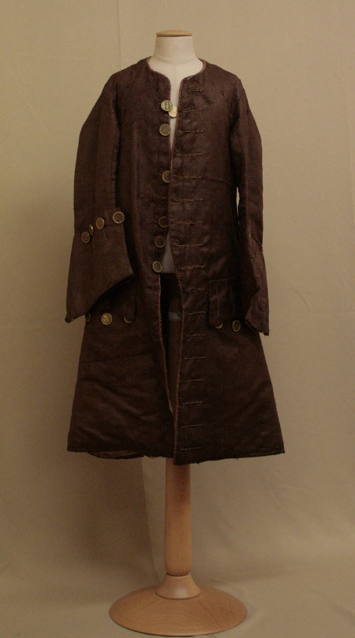 Marsina in losanga (derivata da diagonale) operata liseré, marrone castagna con fondo a minute losanghe e piccoli meandri di fiorellini tono su tono; profili in nastro di seta marrone.\nScollo profilato (h 1 cm), mostre diritte, appena stondate sul busto, 10 bottoni in metallo decorati con intreccio di lamelle (di cui 4 mancanti) disposti dallo scollo a sotto la vita e 17 occhielli di cui funzionali i 10 corrispondenti ai bottoni.\nTasche sotto i fianchi con patta sagomata e 4 bottoni e occhielli decorativi.\nManiche lunghe, larghe al fondo con altissimi paramani (accorciati perchè consunti) con 4 bottoni e occhielli decorativi.\nDorso molto ampio che scende sotto il punto vita; falde posteriori molto svasate, con folto gruppo di pieghe laterali, decorate da 5 bottoni; spacco centrale con 8 coppie di occhielli decorativi.\nPesante infustitura nelle falde, fodera in tela di lino naturale.