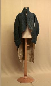 Marsina in velluto riccio operato, liseré, color azzurro piombo, con motivo di minuti pois a gruppi di tre, posti a scacchiera.\nAlto collo a cinturino (h 10 cm), mostre appena stondate sino al torace e falde marcatamente sfuggenti verso il dietro. 9 bottoni rivestiti e 5 occhielli corrispondenti al di sopra della vita. \nSotto il punto vita patte ornamentali sagomate e al di sotto 3 bottoni decorativi.\nManiche molto lunghe con leggera arricciatura in alto, aderenti, sagomate con paramani con 3 bottoni decorativi.\nDorso che scende appena sotto il punto vita; spacchi laterali aperti entro piega, decorati da bottone in alto e all'orlo, all'interno delle pieghe tasche comprese nelle falde. Spacco centrale appena sovrapposto. Fodera in diagonale bianca.