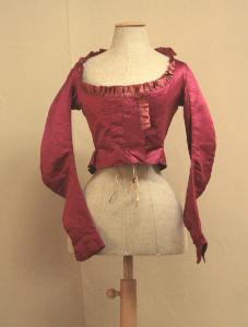 Giacca spencer in raso rosso lampone. Corta poco sopra la vita, davanti in due pezzi con aggiunte presso l'apertura, incrociati al centro senza sistema di chiusura. Dorso in due pezzi, romboidale. Scollo molto ampio, ovale, profilato da ruches in nastro pieghettato in colore più chiaro. Linea delle spalle molto arretrata, maniche lunghe a coprire la mano, aderenti e sagomate e svasate al fondo con spacco chiuso da 2 bottoni e occhielli. Lungo l'orlo sono inseriti nei fianchi e sul dietro 4 piccoli gheroni; il quinto centrale posteriore è prolungamento del dorso e si rilevano tracce della probabile presenza di bottoni decorativi.\nFodera in tela bianca con aggiunte sul davanti in tela rossa; sul davanti sono aggiunti due piccoli lembi da chiudere con lacci sotto il seno. Al centro dietro è fissata una fettuccia.\nLa giacca potrebbe essere stata modificata nell'apertura anteriore.