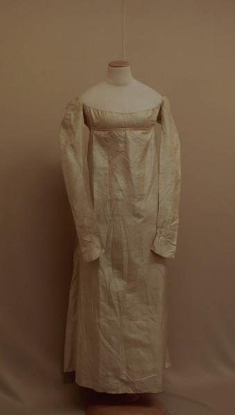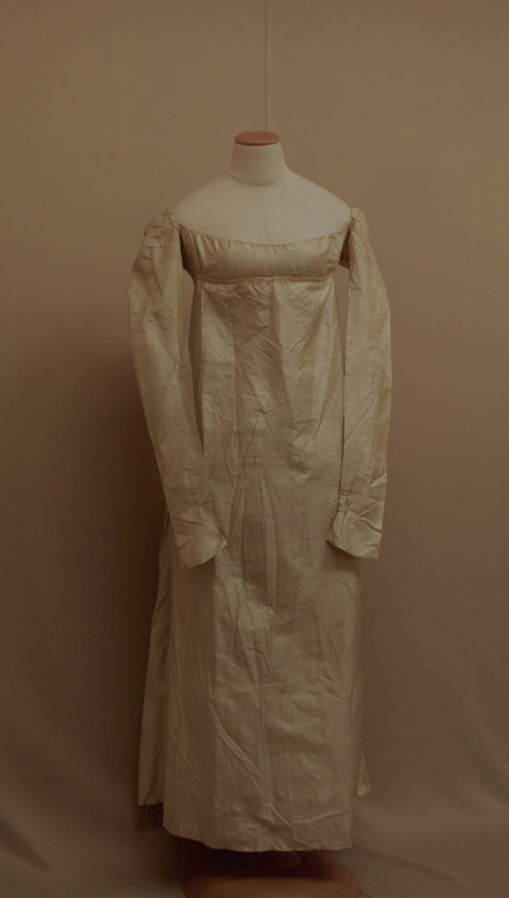Abito di linea impero, lungo, svasato al fondo, in taffetas verde acqua chiarissimo. Corpino anteriore in un pezzo, dorso trapezoidale in due pezzi e due fianchette. Ampio scollo ovale, apertura posteriore chiusa in alto da cordoncino passante a coulisse nello scollo e da una seconda coulisse a quattro cordoncini che restringe il telo centrale posteriore della gonna nel punto di attacco al dorso. Cinturino inserito tra corpino e gonna. Spalle sottili, maniche lunghe a coprire la mano, aderenti e leggermente svasate al fondo. Gonna con davanti ad un telo e dietro a due teli e due gheroni. Orlo diritto. Fodera non presente.\nL'abito è stato modificato alterando l'attacco tra corpino e gonna, probabilmente il dietro della gonna è stato rialzato e forse eliminato un accenno di strascico.