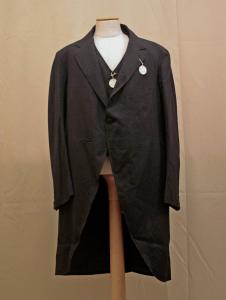 completo formato da giacca redingote, gilè in diagonale nera e pantaloni in diagonale nera rigata. Giacca lunga al ginocchio, con collo a risvolti, mostre chiuse da 2 bottoni sopra la vita e falde sfuggenti. Taschino con patta cucita a sinistra e tasca orizzontale a destra, inserita nella cucitura al punto vita. Dorso ampio che si restringe al punto vita, fianchette. Sul dietro spacco centrale sovrapposto entro finte pieghe, decorate da 2 bottoni in alto. Maniche lunghe, sagomate, con spacco al fondo chiuso da 2 bottoni decorativi. Fodera in diagonale nera. \nGilè monopetto lungo alla vita con piccole falde, scollo a V, chiuso da 5 bottoni; taschino in alto a sinistra e 2 tasche con patta cucita. Dorso in diagonale nera regolabile con coppia di cinturini con fibbia. Fodera in diagonale nera\nPantaloni morbidi, con piega; alta cintura con bottoni predisposti per bretelle. Patta verticale chiusa da bottoni; tasche oblique inserite nella cucitura dei fianchi, taschino a destra sotto la cintura e sul dietro due tasche con patta sagomata. Sul dietro, sotto la cintura, coppia di cinturini con fibbia.\nAll'interno della giacca etichetta in nastro operato.