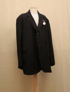 giacca monopetto in diagonale nera, collo con risvolti a lancia; chiusa da tre bottoni. Taschini e tasca a sinistra; a destra 2 tasche sovrapposte. Maniche con spacco al fondo fermato da 2 nbottoni decorativi. Foder in diagonale nera, nelle mancihe in taffetas avorio rigati celeste e nero.\nAll'interno della giacca etichetta in nastro operato.