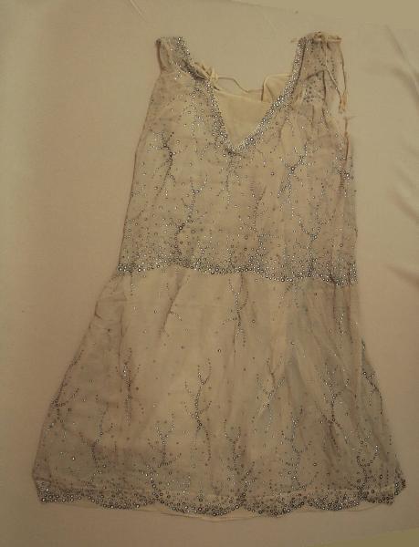 Abito a vita bassa, lungo al polpaccio, senza maniche; in crespo leggerissimo color avorio, disegno preparatorio stampato a puntinatura sul quale sono fissati strass argento di varie misure incastonati attraverso il tessuto.\nCorpino morbido con profondo scollo a V davanti e dietro, a vita bassa definita a smerli. Gonna in un unico telo, leggeremente arricciato, aperta davanti con lembi stondati. Nell'apertura è inserito un gherone in sbiego. \nL'abito è corredato da sottabito con spalline nello stesso tessuto che chiude parzialmente lo scollo, i cui margini sono cuciti al sottabito.\nConfezionato con cuciture a mano.