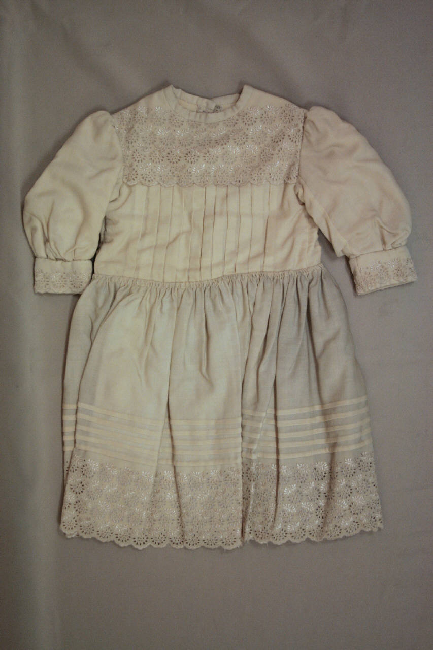 abitino in diagonale color crema; corpino girocollo con sprone diritto e pieghe piatte. Sprone doppio con ricamo meccanico ad imitazione del ricamo Madera, con motivo a piccoli fiori stilizzati posti a scacchiera. Apertura posteriore chiusa da bottoni. manricamato che lunghe arricciate, con polsino ricamato. Corpino e maniche doppiati e imbottiti.\nGonna fittamente arricciata in vita, con pieghe orizzontali cucite presso l'orlo e banda ricamata come il doppio sprone. Sottogonna cucita in vita in tela avorio. All'abito è abbinata una mantellina corta nello stesso tessuto ricamato, con fitta arricciatura allo scollo.
