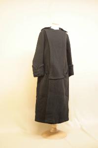 soprabito lungo alla cavoglia, in diagonale nera garzata, foderato fino alla vita in diagonale di cotone nero. Girocollo, con collo posteriore semplice a punte lunghe; chiuso a doppio petto da 3 bottoni (perduti) all'altezza dei fianchi. Impunture sulle mostre simulano una lunga pettorina che scende sotto i fianchi, raccordandosi alle tasche sagomate laterali. Dietro in 4 pezzi: i teli laterali proseguono sui fianchi verso il davanti formando le tasche. Sul dietro sotto la vita è inserito un pannello con margine superiore centinato, forse sostituito per allargare il capo. Maniche molto lunghe con alto paramani chiuso da cinturino decorativo. La sovrapposizione delle falde anteriori è stata invertita chiudendole con automatici; all'interno della mostra sinistra è stato applicato un taschino. In una delle tasche è riposta la martingala asportata.