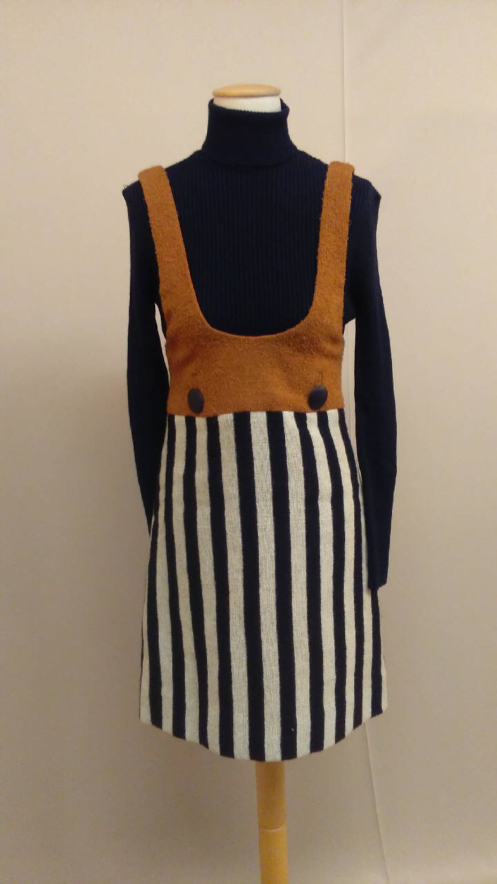 Completo formato da maglione, abito scamiciato e calzamaglia. Maglione aderente a collo alto e calzamaglia in maglia a coste nera. Abito scamiciato corto sopra il ginocchio, con ampio scollo rotondo e lunghi spallini. L'abito è tagliato in vita: corpino in tela di lana bouclè ocra con 2 grandi bottoni e occhielli a filetto non funzionali al punto vita, la gonna svasata è in tela doppia a rughe bianche e nere. Apertura posteriore centrale con cerniera e gancio. Fodeta in taffetas arancione. Etichetta all'interno dietro, in nastro operato; altra in carta nella cucitura del fianco sinistro.