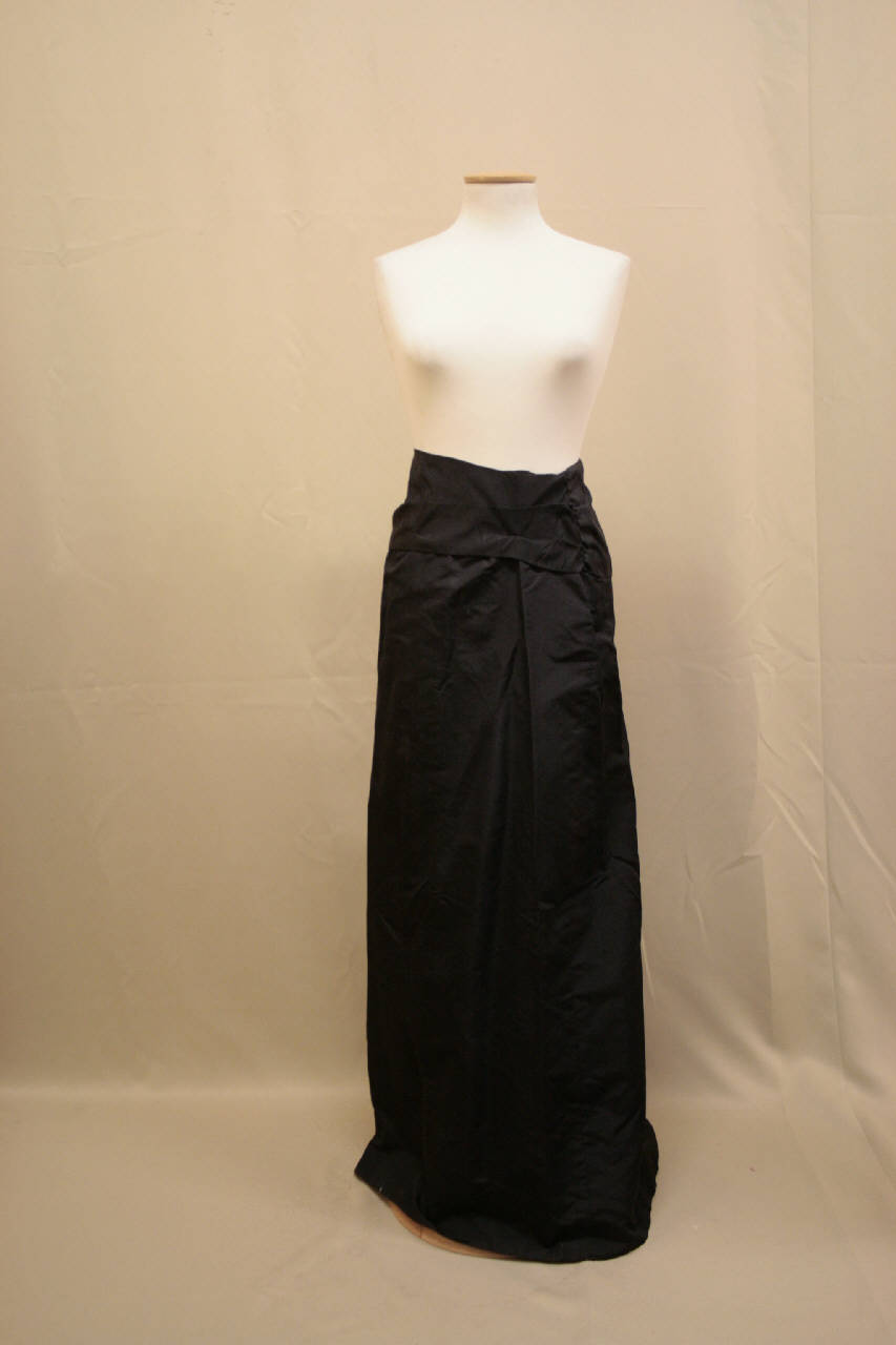 Gonna lunga in gros de Tour nero, di linea leggermente svasata, con corto strascico. I due teli che formano la gonna sono uniti davanti con cucitura decentrata. Al centro dietro i teli sono uniti con cucitura obliqua che forma punte ricadenti e breve strascico. Lungo la vita è applicata un'alta fascia dello stesso tessuto, drappeggiata, che dietro forma un finto fiocco che nasconde la cerniera. Fodera in raso.
