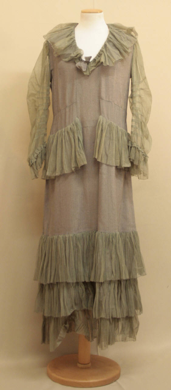 Abito a vita bassa, lungo alla caviglia, in crespo cangiante grigio/rosa e gale in tulle grigio-verde. Corpino lungo ai fianchi, sottolineati sul davanti da inserti stondati e da gala che gira attorno anche sul dietro. Scollo a V profilato da gala; maniche di tulle, lunghe sagomate nella parte interna da pieghe cucite, arricciate al fondo con gala. Gonna diritta con tre gale sovrapposte dal ginocchio in giù. Apertura sul fianco sinistro chiusa da automatici.