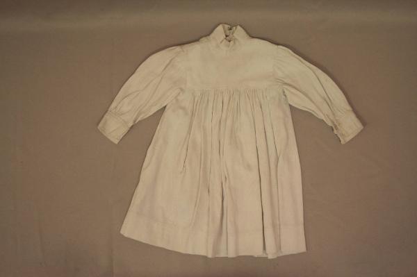 Abito grembiule in piquet operato con piccole slegature di trama. Sprone che sostiene arricciatura, collo a cinturino. Apertura parziale posteriore con bottoni di madreperla. Maniche lunghe con polsino. Tasca sul fianco destro.