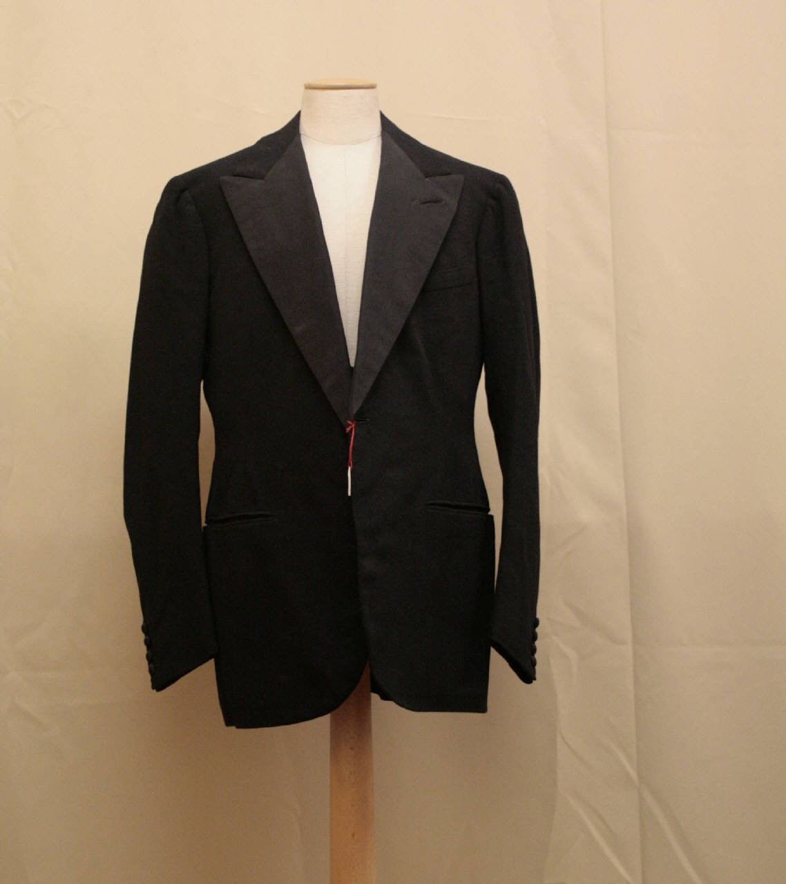 Completo smoking formato da giacca, gilè e pantaloni, in diagonale nera. Giacca a un petto, chiusa da 1 bottone; collo con risvolti a lancia in cannellato nero. Tasche a filetto.Maniche con spacco fermato da 4 bottoni. Gilè a un petto, scollatura molto bassa e collo sciallato. Dorso in raso nero, fodera in raso bianco. Pantaloni morbidi, alti in vita e con pinces; bottoni per bretelle predisposti nella cintura. Patta chiusa da bottoni. Sulle cuciture laterali è applicato un nastro di raso nero. Etichetta stampata con marchio e indicazione del proprietario.