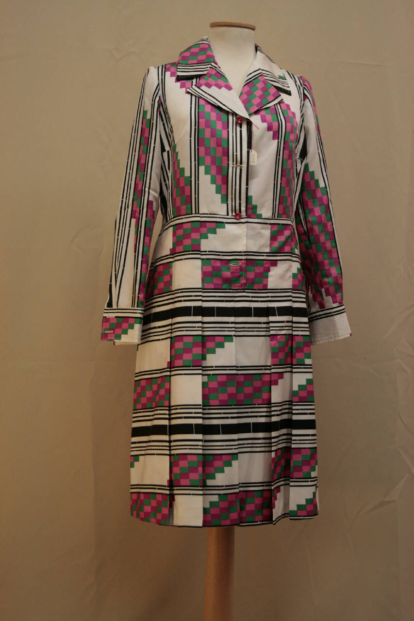 abito chemisier corto al ginocchio, in diagonale bianco stampato in nero, fucsia, verde, con motivi geometrici divisi in bande o rigature. Corpino a camicia, chiuso da bottoni fino alla vita, maniche lunghe con polsino. Gonna svasata, con gruppo di pieghe piatte sul davanti. Cintura nello stesso tessuto. Etichetta in nastro operato con marchio, cucita all'interno.