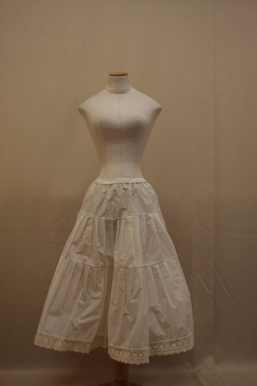 Mezzo sottabito a crinolina (sottogonna) in tessuto rigido ad imitazione taffetas bianco. Stretta in vita da elastico. Formata da tre balze arricciate; orlo profilato da merletto meccanico ad imitazione Sangallo.